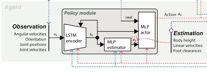 HL action policy (GPU) → *Adaptation module (GPU)* → LL action policy (GPU) → TorquesWhere RMA had a large-ish latent vector, there are similar approaches toward predicting parameters with more physical meaning, from a reduced or a full state estimate. These state-estimation networks concurrently learn base state and contact probabilities alongside policy, enabling better perception of ground interactions.