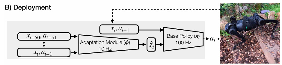 RMA: Rapid Motor Adaptation (2021) introduces a dedicated adaptation module that predicts a set of “latent parameters” that can adjust the action policy to better suit different conditions. These varied conditions are trained by randomizing in simulation, potentially suffering from a few of the same issues with out-of-distribution encounters and training difficulty.