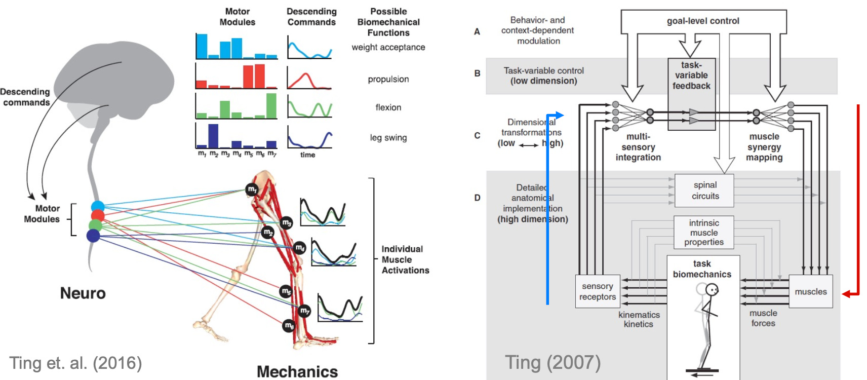 Animals have an abundance of sensory inputs and muscle, but the number of task-level variables important to any particular task is a lot smaller (Ting (2007)). Going further, Ting et. al. (2015) argues that motor modules arise from neural plasticity in spinal structures that selective coordinate and co-activate multiple muscles. The result is that animals can control tasks like balancing in a hierarchical fashion, keeping the dimension of the task-space control low.