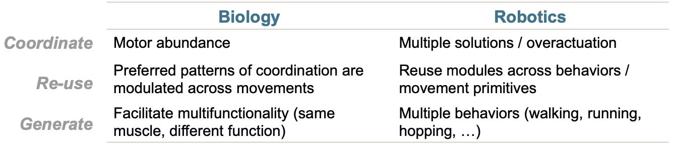 Motor modules can help navigate a “difficult-to-search and nonlinear set of neuromechanical solutions for movement” (Ting et. al. (2015)) as well as the “curse of dimensionality” in various engineering disciplines. This has clear implications on the computational requirements for algorithms.