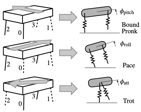 We showed using simulation, and by physically altering the inertia characteristics of sagittal-plane Minitaur by adding an “inertia bar” to its back, that we could indeed get both bounding and pronking limit cycles by programming its front and rear ends as completely independent vertical hoppers:
