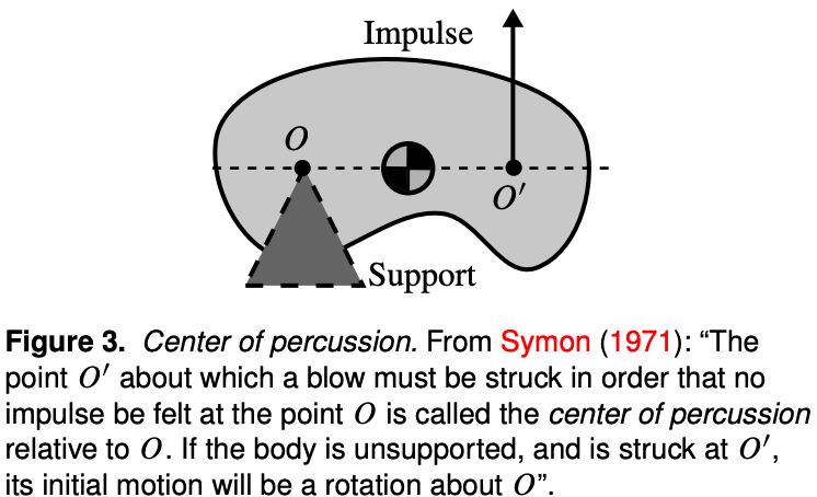 The “coupling” is physically instantiated by the body itself, and its inertia properties have a significant effect on the type of coupling. The center of percussion is a well-studied property of baseball bats, juggling clubs, etc. that relate impulses on one end of the object to the wrench on a different point along the object. We used this definition: