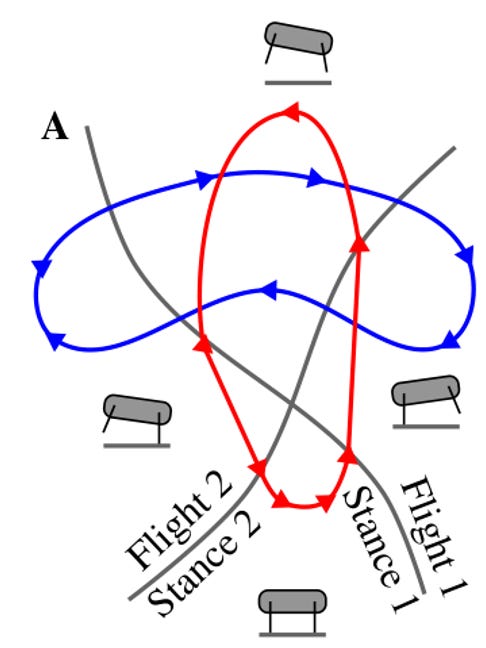 Looking more closely the picture above, the axes in the plot are the “phases” of the two legs, a concept we talked about in the accompanying hybrid averaging paper. That identification now encourages us to think about our original quadruped as a pair of (vertical) hoppers “coupled” by a body.